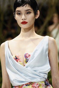 Naturally, Dior wouldn't accessorize with anything less than the best, so lead makeup artist Pat McGrath topped a lipstick base with Swarovski crystals. The dazzling display included pink, purple, and red versions. To keep the bling-adorned lips as the focus, McGrath kept the rest of the makeup extremely simple applying a light dusting of Diorshow Mono Eyeshadow in Grege to the lids and keeping the face bare.