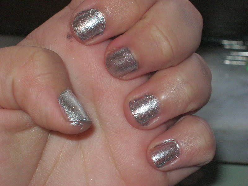 For the first manicure I am going to show you, I just painted my nails with Sally Hansen Xtreme Wear Polish in Celeb City. Celeb City is a shimmery silver that only required one coat for nice opacity. I thought the shimmery silver would make for a nice base for the dots I was going to make.