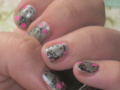 To create this look, I used 2 coats of China Glaze Hook and Line. Then I used the black stamping polish and the Hello Kitty face on the plate to make one Hello Kitty face on each of my nails. Then I used my dotting tools to make a few pink polka dots on each of my nails. The pink polish is by Kiss, it's called Bikini Pink.